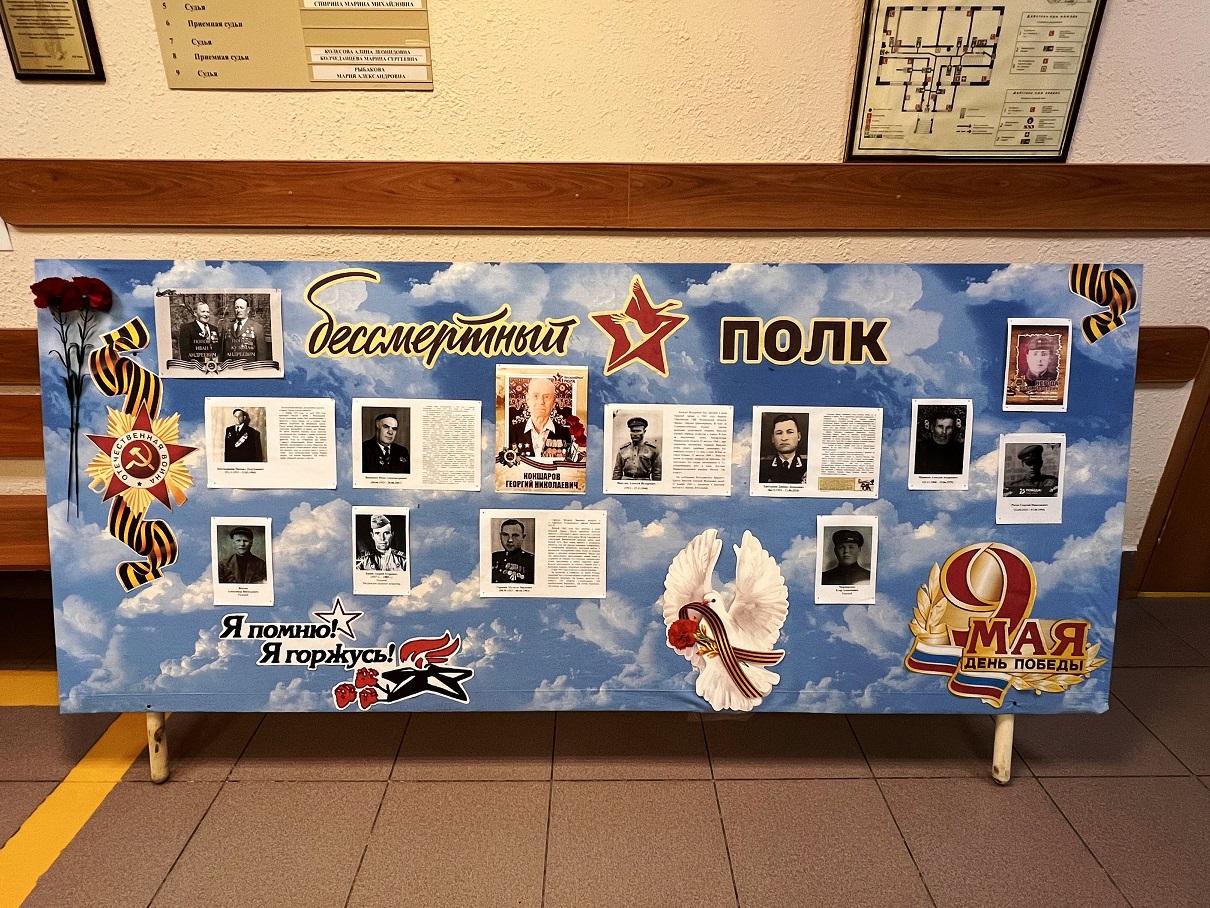 В канун 80-летнего юбилея Победы в Великой Отечественной войне 1941-1945 годов коллективом Каргапольского районного суда Курганской области оформлен памятный стенд «Я помню! Я горжусь!». Сотрудниками суда собраны фотографии родственников – участников войны, частью многочисленного Бессмертного полка стали Викулов А.Ф., Воронцов И.А., Гарипов М.З., Жилин А.В., Колчеданцев М.Д., Краев А.Е., Манаков А.А., Марковских Е.А., Негода И.И., Попов И.А., Попов К.А., Рогов Г.Н.![]() |