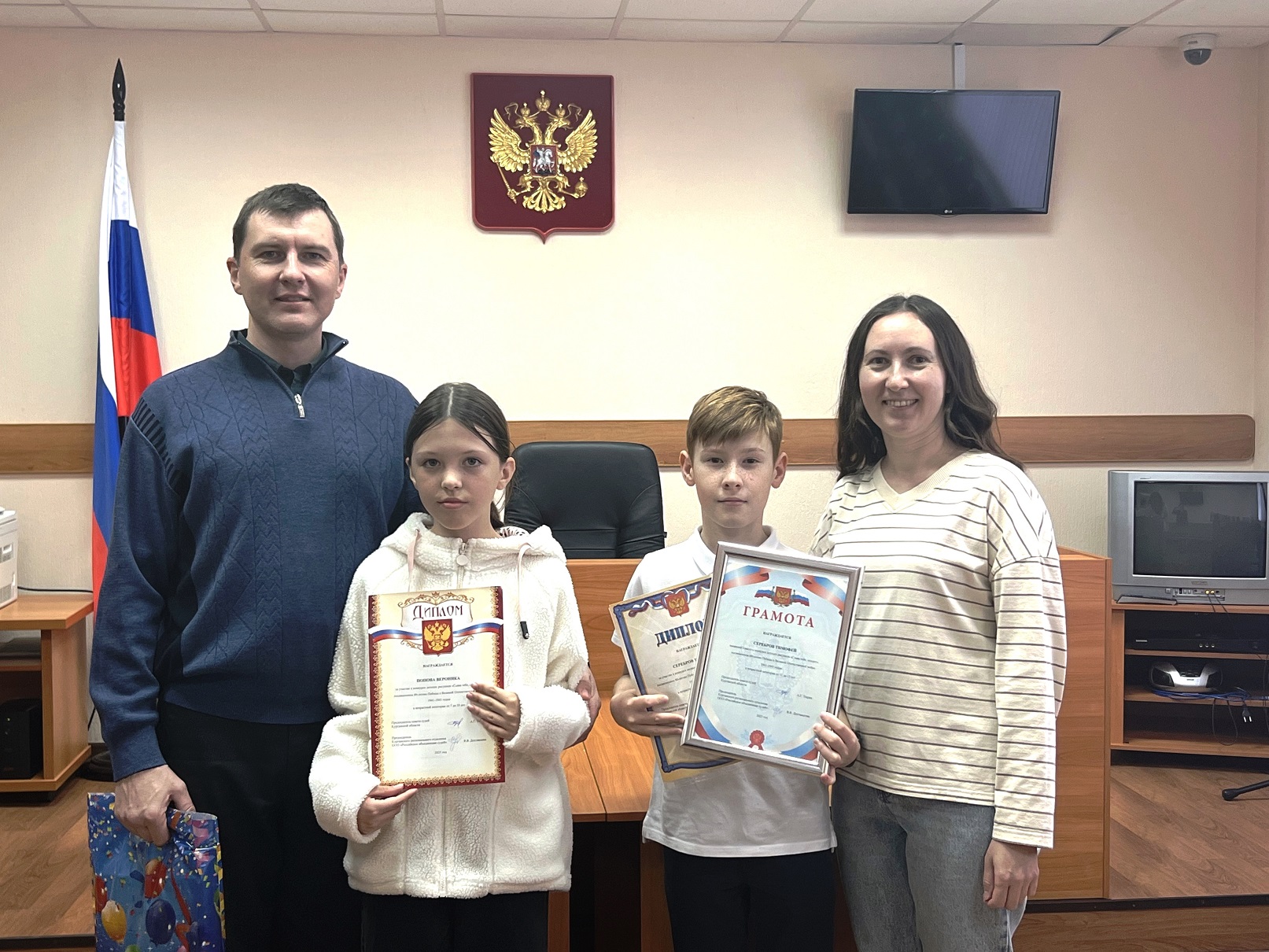 В Каргапольском районном суде Курганской области прошло награждение победителей и участников конкурсов к 80-летию Победы в Великой Отечественной войне 1941-1945 годов, организованных Курганским региональным отделением ООО «Российское объединение судей». Дети работников аппарата суда приняли активное участие в конкурсах, проявив чувство патриотизма и творческие таланты. Грамотой за 1 место в конкурсе детских рисунков «Слава тебе, солдат» и дипломом за участие в конкурсе видеороликов «Стихи военных лет» награжден Серебров Тимофей. Дипломы участников конкурса детских рисунков «Слава тебе, солдат» также вручены Поповой Веронике, Корепановой Ксении, Корепанову Максиму. И.о. председателя суда Спирина Марина Михайловна вручила ребятам памятные подарки и пожелала дальнейших успехов в учебе и творчестве. ![]() На фото: Попов А.С., Попова Вероника, Серебров Тимофей, Сереброва Н.Ф. |